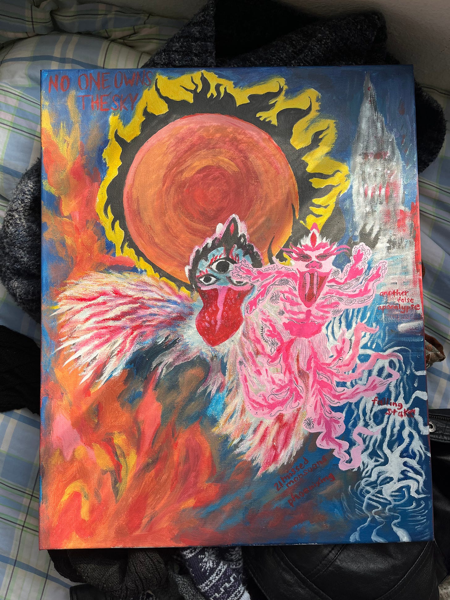 Made a mixed media (sharpie pen/acrylic paint/oil pastel) canvas that’s based on an epic poem That Is Being Written On My Laptop’s Microsoft Word. Still a work-in-progress bc I want to add beads & embroidery. Took one line from each page. The narrator is both an Angel of History and a dumb bitch.