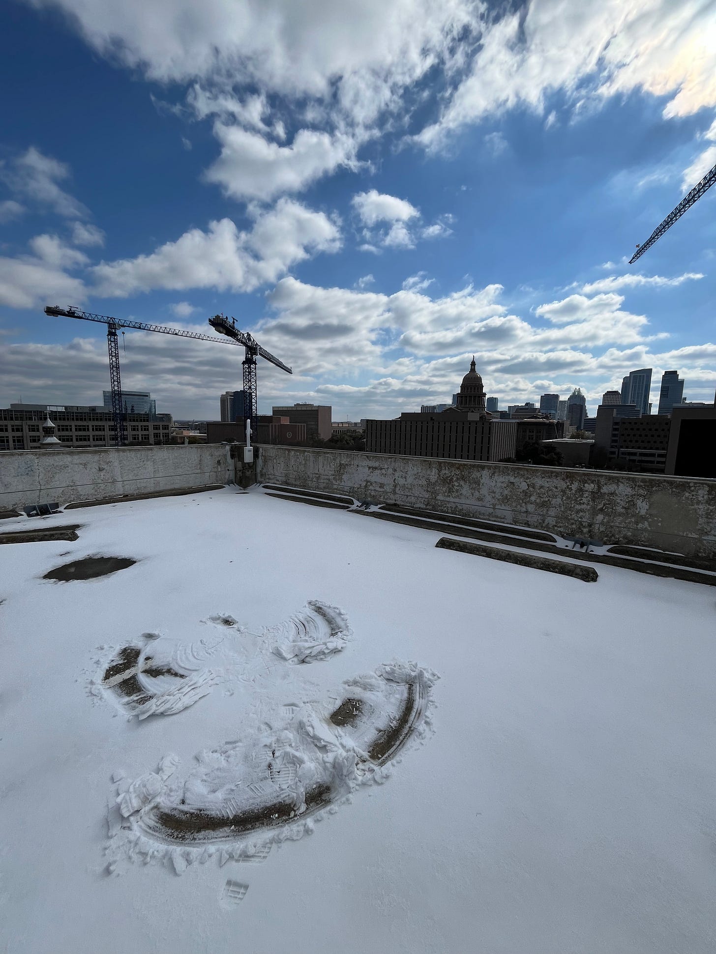 I walked around looking for a patch of purity big enough to make a snow angel, until…my fave parking garage rooftop (my panopticon)!!! Spyglassing the Texas Capitol.