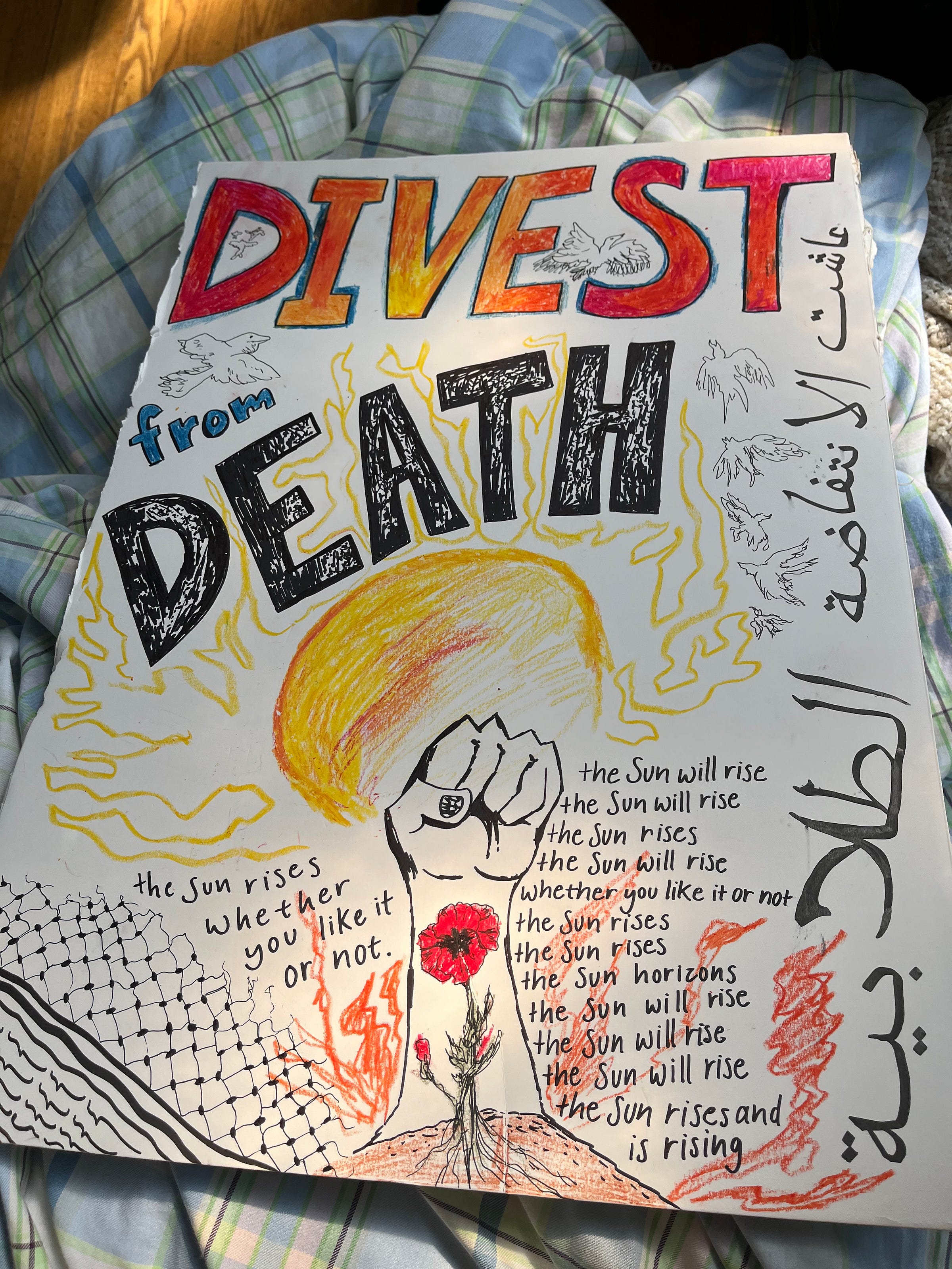 Is this body mine alone when people— Auntie [F], comrades, Hafsa, strangers, have fed me for 3 days? When I linked arms till they were sore? When I zoned out and my friends’ arms pull me away from the cops? When E tied my keffiyeh for me in the bathroom? We got each other.