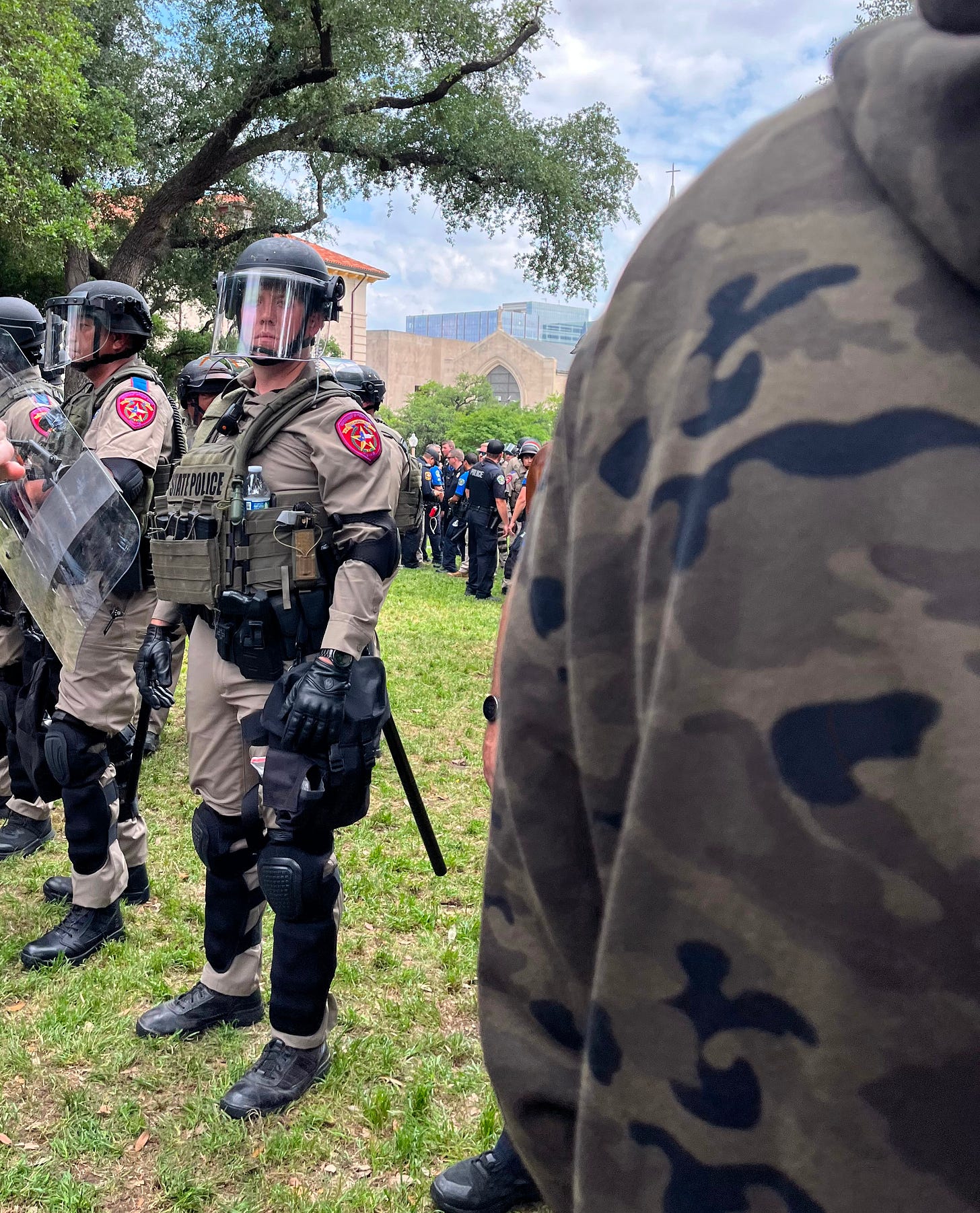 Commands hissed through the crowd like telephone whispers. We hopped fences, walked through buildings, walked on bushes. We waved, texted, learned each others’ names, or Signal usernames. This is our home turf— statetroopers from Houston having sleepovers get lost and sundazed (can’t imagine what they talk ab). They started grabbing ppl in yellow vests like old men developing cataracts, or Spanish bulls mad about red cloth. The rest shed their vests w all the violence of desecrated flowers.
